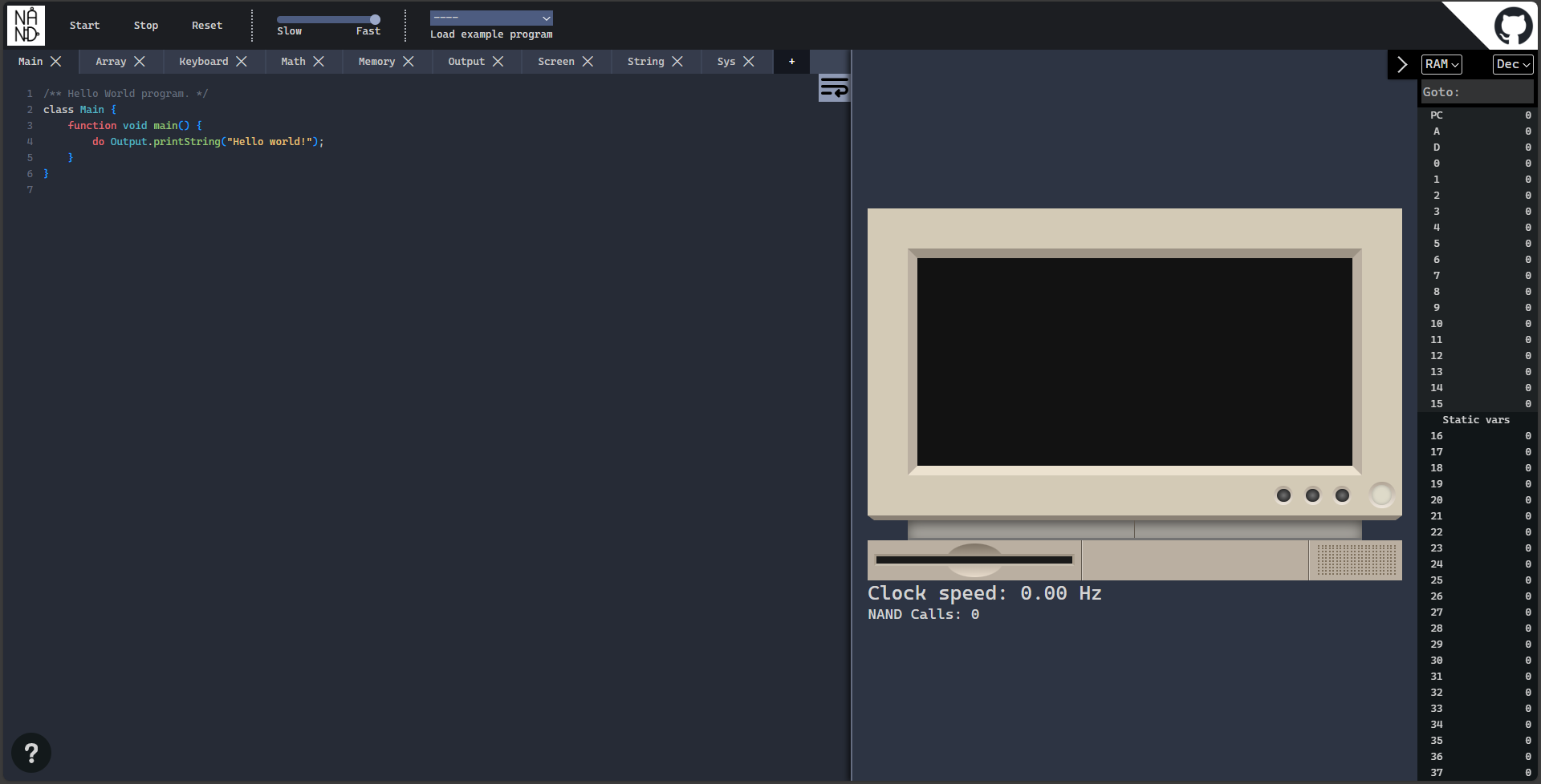 一台图灵16位计算机,实现了CPU、汇编器、虚拟机翻译器和编译器的规范,同时将该平台移植到web上,并集成开发环境和用户界面