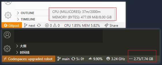 Gitpod的云端 vscode 优化的有点厉害啊,同样的项目、同样的插件,内存占用比Github的Codespaces低很多,能多开好几个docker了!!