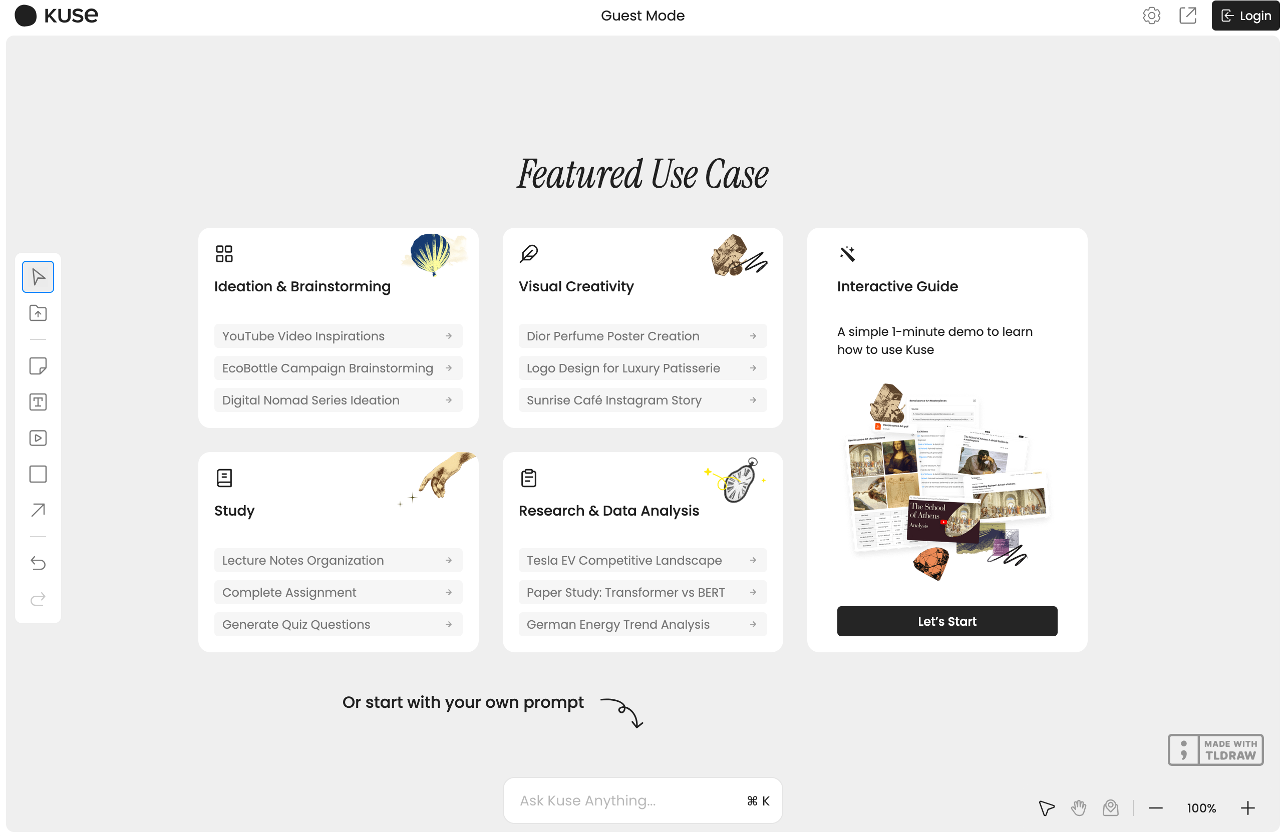 Kuse: AI白板应用 also posted on: | share Copy Link Twitter Mastodon Bluesky Facebook LinkedIn Reddit WhatsApp Telegram Email Kuse 是由 tldraw 开发的一款基于白板的 AI 助手平台,可以进行文档处理、图片处理、可视化展示、代码预览、数据分析等多种任务,整体交互很跟手顺滑,可以作为 AI 笔记应用但个人感觉价格略贵,虽有标准免费层,但主力使用肯定要上30美金的 Pro 层,教师和学生10美金每月。 kuse-1 kuse-2-gif